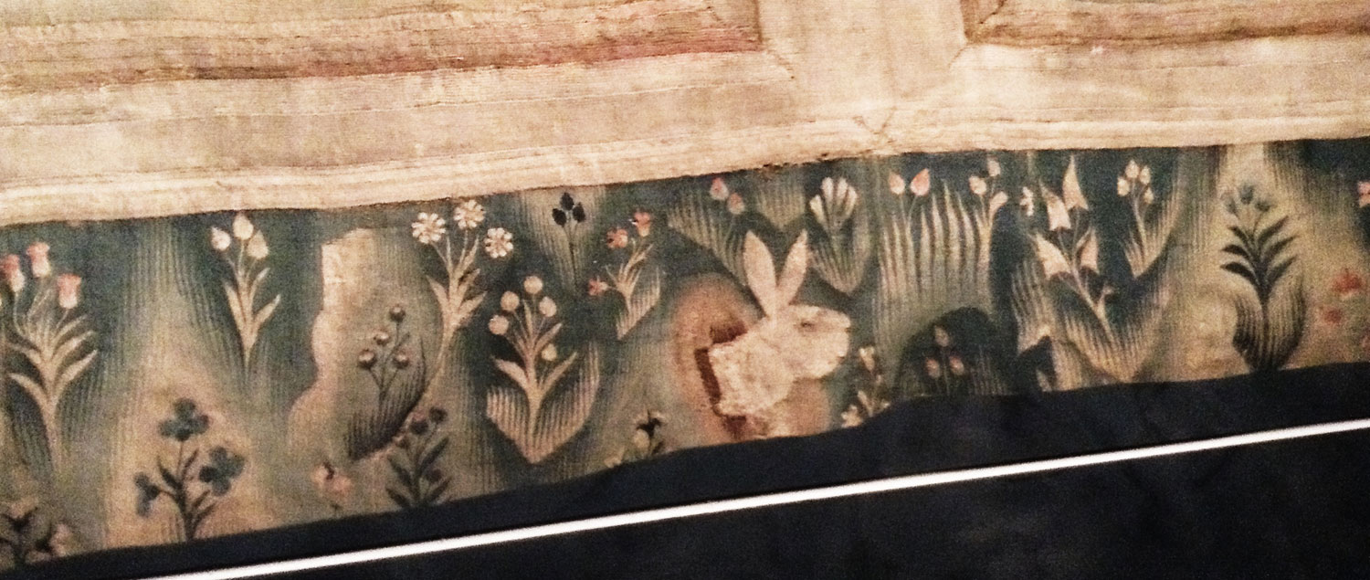 Alla base di uno dei pannelli intravedo una coda di coniglio che s'infila in una tana ,grande quanto un pallone da calcio, e così percorro tutto l'arazzo alla ricerca della testa. La ritrovo più avanti, solitaria in mezzo ai decori floreali, e mi chiedo cosa stia a significare poiché non vi sono altri animali sulla fascia.